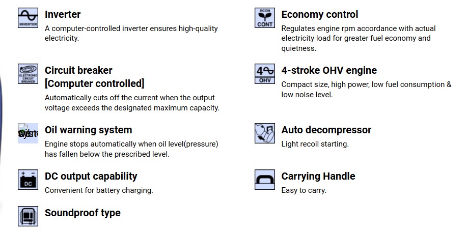 The inverter system with pulse width modulation produces higher-quality, cleaner electricity, and sound absorbing materials keep the volume down. Combined with the easy to use single-sided control panel, it makes for a quiet and convenient power source.